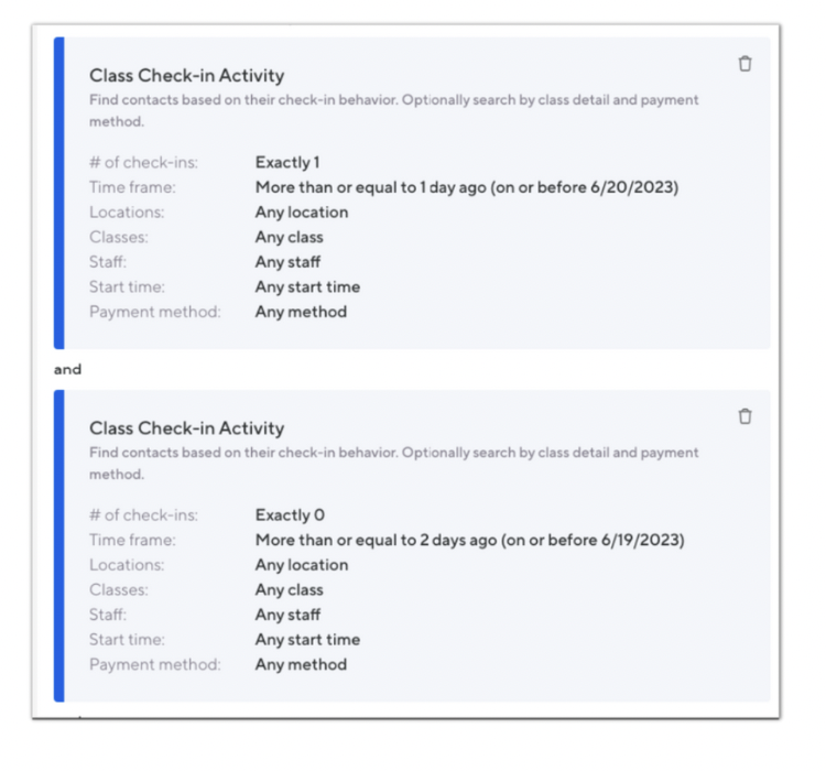 Here is an example Audience that displays everyone who had their first visit yesterday and they booked using a drop-in:
