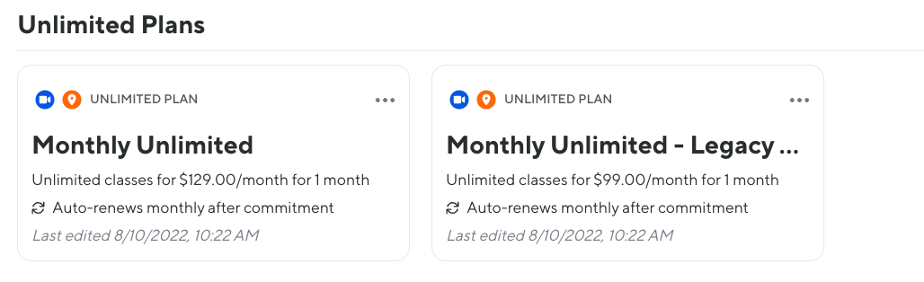 For example, if the current cost of your studio’s monthly unlimited is $129 per month but in the past the selling cost was $99, and you wish for those client’s to continue paying $99 per month after migration, you must create a $99 plan in Walla.