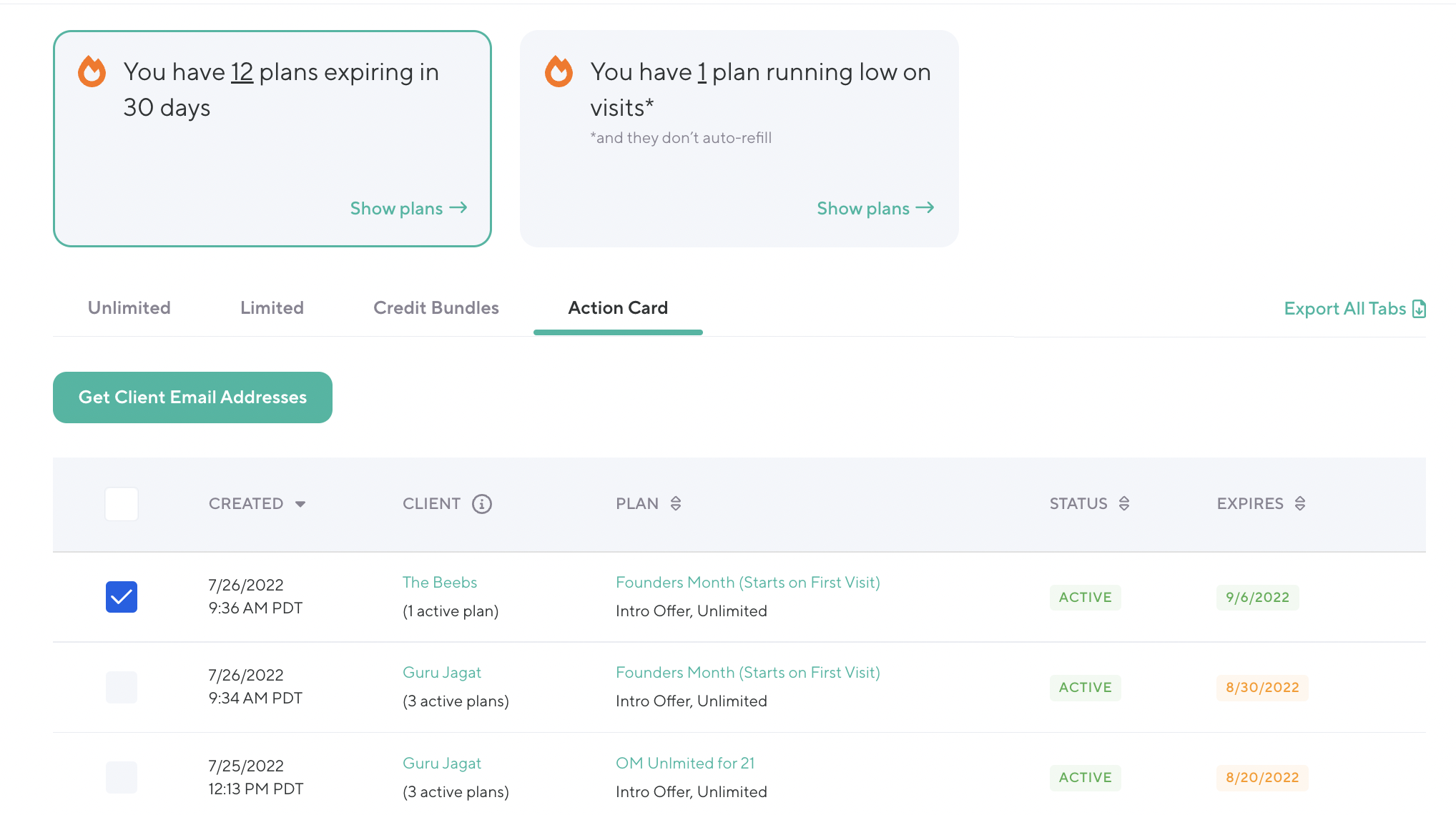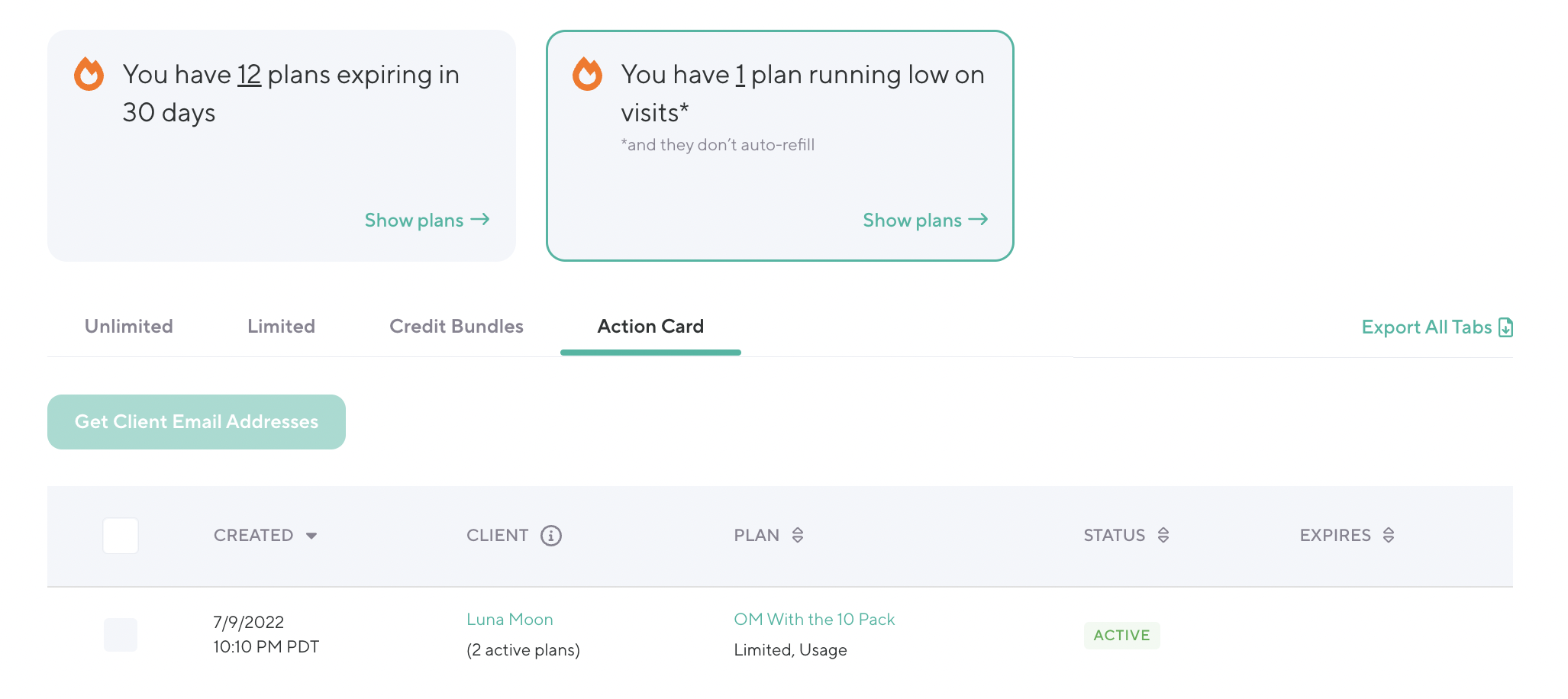 The Action Cards are a great way to proactively reach out to clients before their plans expire or run out of visits. Select clients from the report to copy selected client email addresses. For recurring plans, this created date is the most recent payment date from the plan's current payment period. For non-recurring plans, this is the date the plan was created in the system. This typically is the same date at a plan's start date, unless a future start date was chosen or the plan starts on the client's first visit.