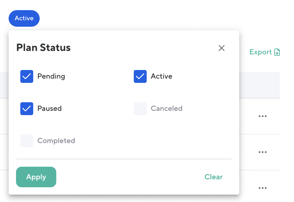 Active: Plans that are not Pending, Paused, Canceled, or Completed. Active plans include plans with scheduled cancelations and pauses. Plans with failed payments are also considered active