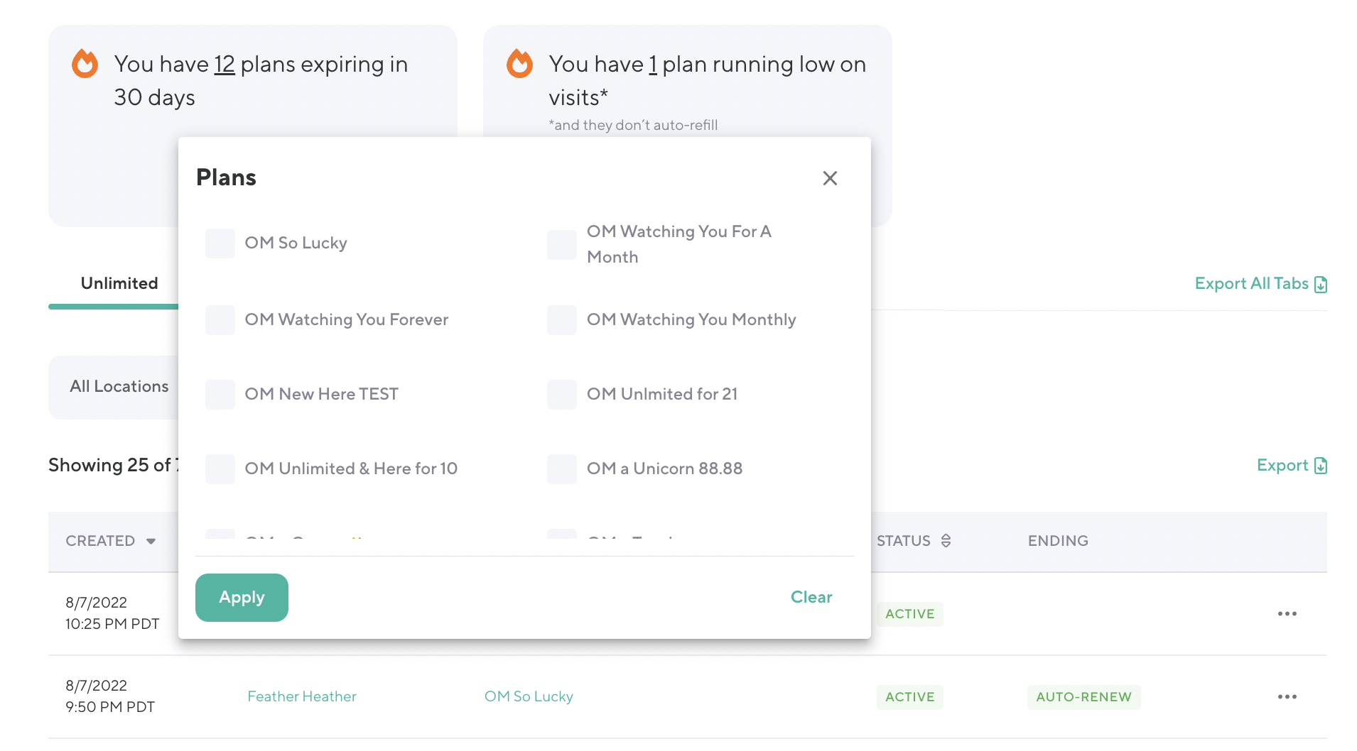 View all plans sold, including active and inactive plans. Use the Action Cards to view all plans that expire within the next 30 days, view limited plans/credit bundles that are running low on visits, and copy selected client email addresses to take action on the report's results. Export all tabs of the report, the Unlimited, Limited, and Credit Bundles tabs with filters applied, and export Action Card results for further analysis.