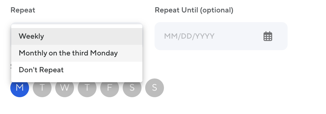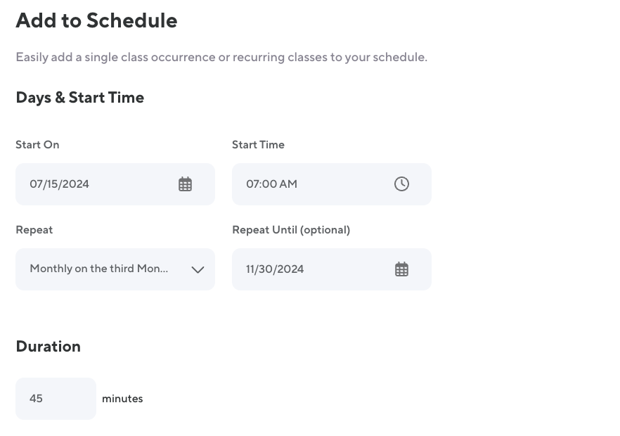 Choose if the class repeats weekly, once a month on a specific day, or if the class only happens once