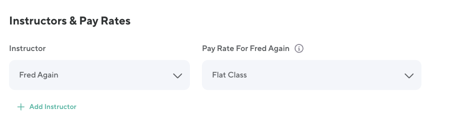 Assign an instructor and a pay rate for the class. You can add additional instructors to the class. Note that only the primary instructor's pay will be calculated on payroll and the instructor will not be listed as client facing on the widget or apps.