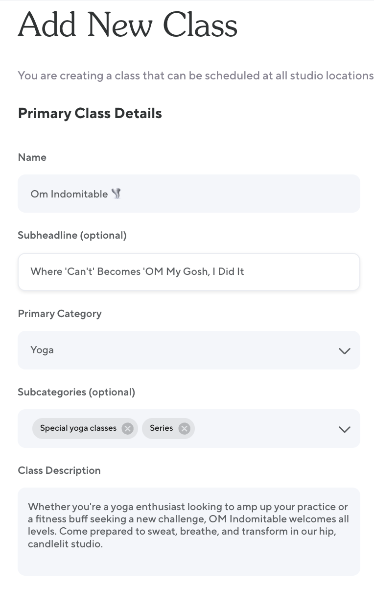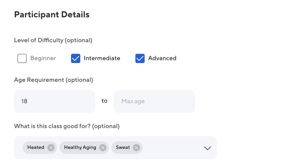 Participant Details: Set expectations for your clients and include details such as age requirements, prerequisites, experience and difficulty level, and what to bring. The optional fields like class subtitles, subcategories, difficulty, help clients better find and determine class expectations before booking—and could increase bookings!