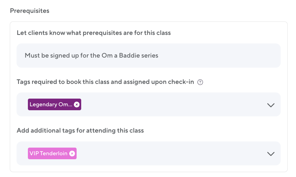 Set the tags assigned upon check-in and/ or set the additional tags the client will be assigned when attending this class