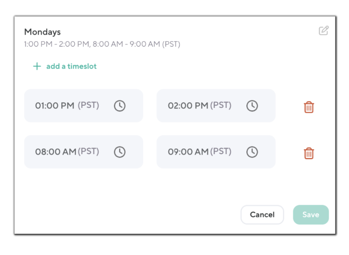 Timeslots must be scheduled on a day of week basis, there is not a way to add timeslots for more than one day of the week at a time. For example, if your staff is available Monday, Wednesday, Friday from 1:00 PM to 2:00 PM, you must select the edit pencil next to each day of the week and add timeslots to each individual day. Currently there is not a way to put in a start and end date for appointment availability.