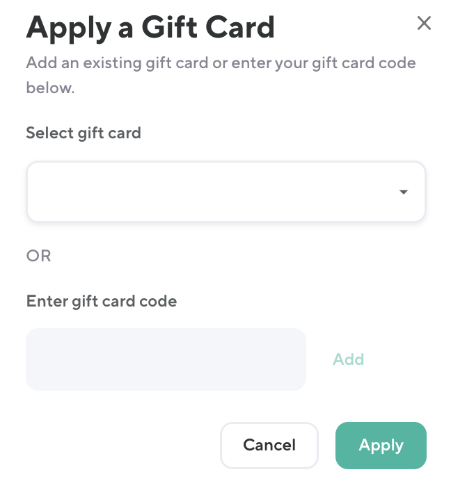 Select the gift card from the drop-down. If there are no gift cards in the drop-down, use the code included in the gift card recipient’s email and select Apply