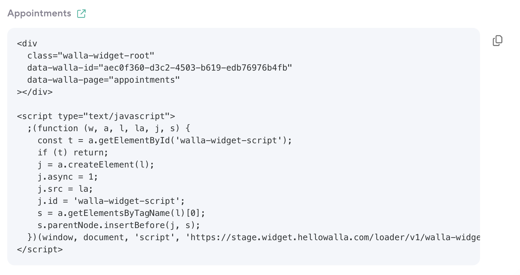 Copy the code to embed the code into your website or select the green copy icon next to the word Appointments