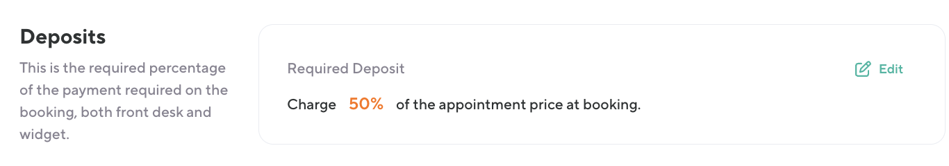 The appointment deposit can only be updated under π Business Settings. It is a global setting that applies to all appointments and all locations.