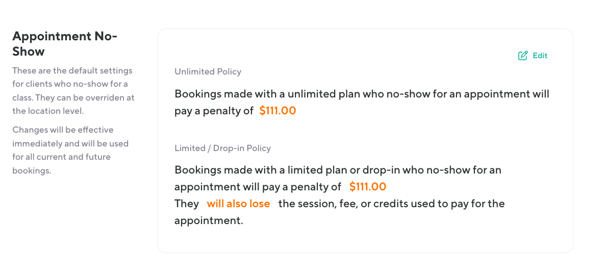 Appointment no-show fees can be applied to both unlimited and limited plans/drop-ins. No-show fees are charged 24 hours after the appointment time.
