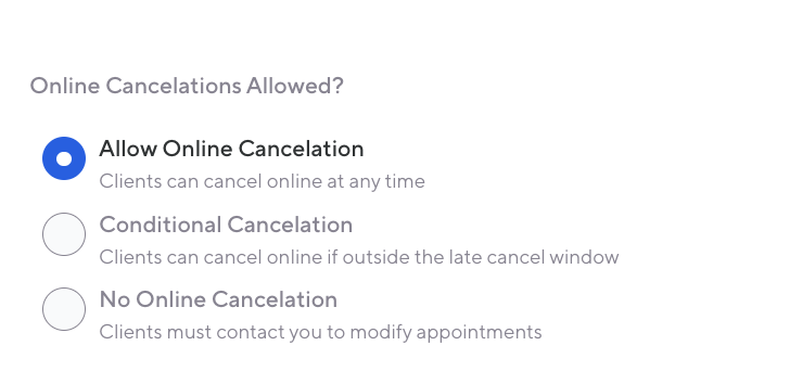The default is set to allow online cancelations but you can choose to only allow cancelations if they are outside the late cancel window or choose to not allow appointment online cancelations at all.