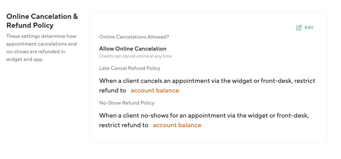 Appointment late cancel and no-show refunds can be refunded to original payment or account balance. Refunds are applied immediately after the late cancel or no-show occurs.
