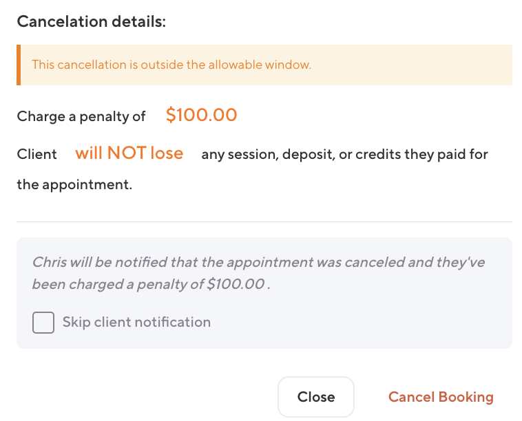 Choose your fees and whether clients lose their session if they miss or cancel late.