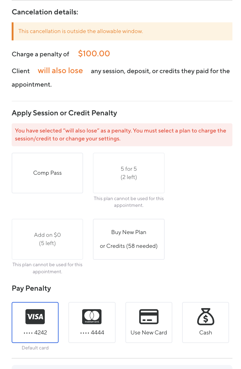When late cancelling an appointment via the Front Desk that was booked unpaid, staff have the option to adjust the fee and pass settings at time of cancelation. In addition, if "will also lose" a pass is selected staff are required to select which plan to deduct the pass from.