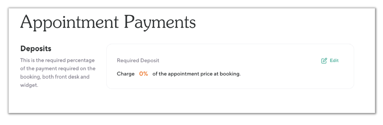 If you'd like to have your client partially pay for an appointment in advance when they book a drop-in appointment, set an appointment deposit. Appointment deposits are set at global level. In other words, the deposit percentage you enter applies to all appointment types at all locations.