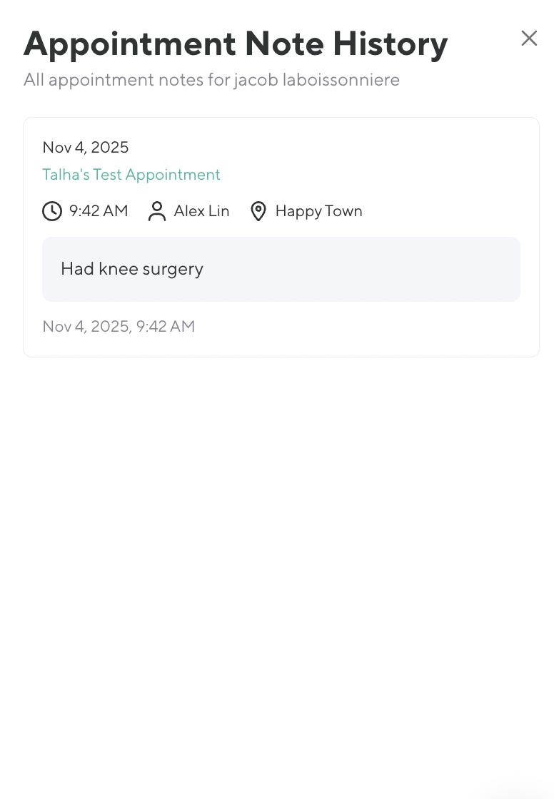 Appointment Notes allow staff members to create and view notes tied to specific appointments, making it easier to track client progress, record important session details, and ensure continuity of care across visits.