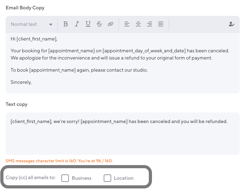 If you’d like to cc your business or location emails, select a Transactional Notification and choose Copy (cc) all emails to
