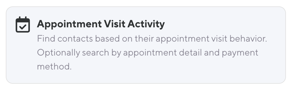 Find contacts based on their appointment visit behavior. Segment clients by visit frequency, timeframe, appointment type, or payment method