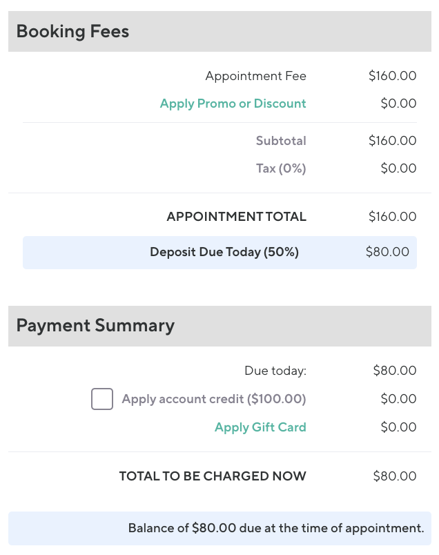 Balance due at time of appointment: This is based on the Appointment Total minus the deposit