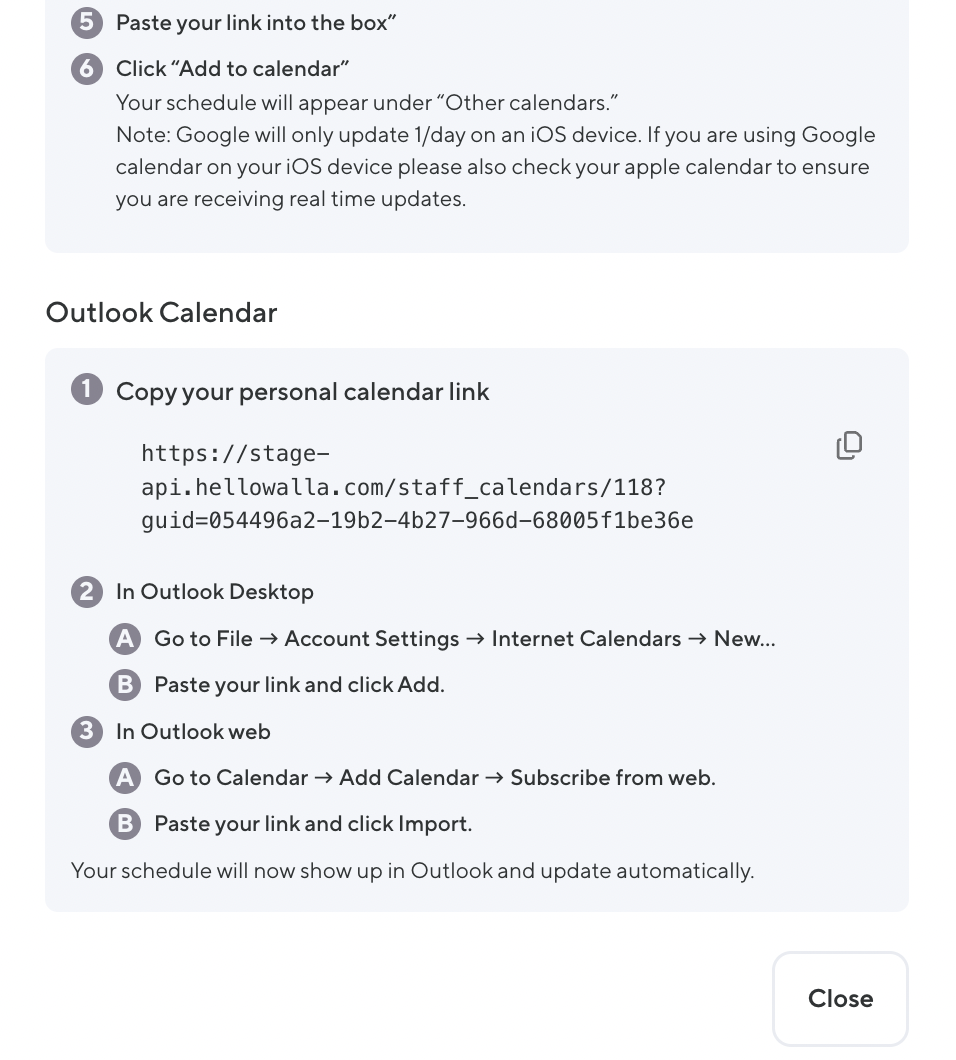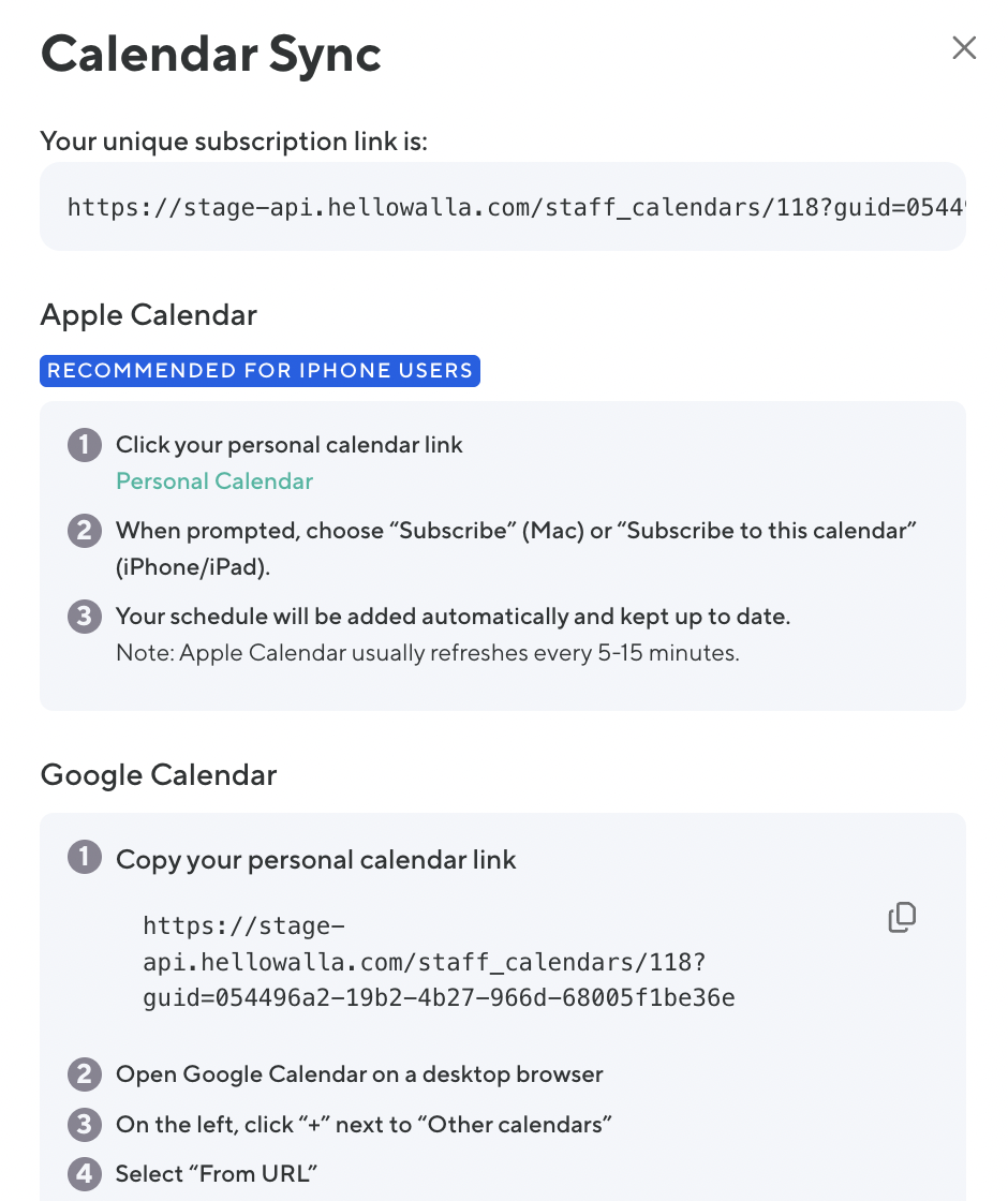 The new Calendar Sync feature makes it easier for staff to stay up to date on their schedules by automatically syncing their Walla appointments and classes to their personal calendars (Google, Apple, or Outlook.)