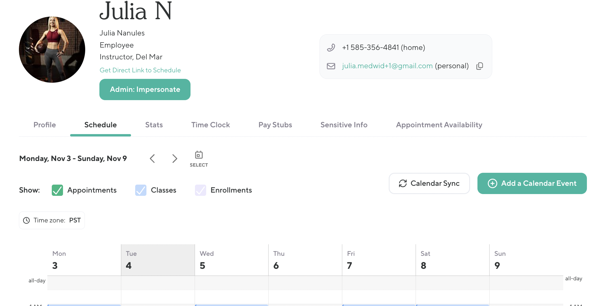 Once connected, all scheduled appointments and classes automatically appear on the synced calendar.