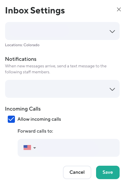 To allow staff the ability to enable this feature, the staff member must have edit access to Inbox Settings: Call Forwarding and SMS Alerts: Access to setup call forwarding. By default, Location Managers and above can edit this feature and this permission can be customized as needed.