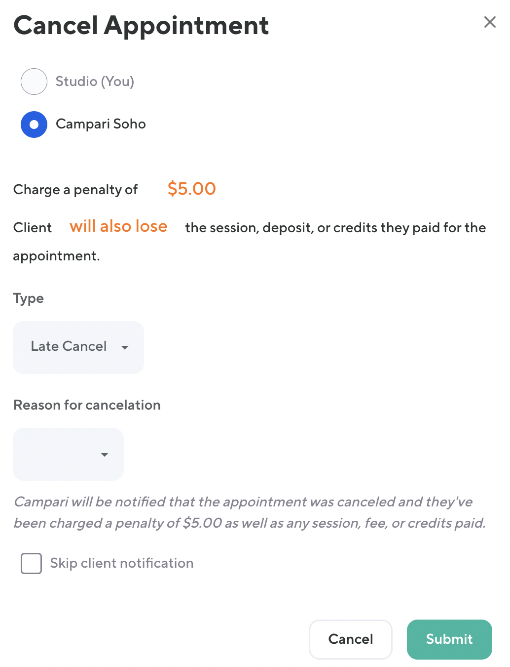 If it is outside the cancelation window, in other words if it is a late cancelation, selecting the client's name will give you the option to charge or not charge the cancelation fee as well as return the session back or not return the session back to the clients pack/ plan. If the client purchased a single session (standard pricing), then choosing will not lose will result in the client being refunded back to their original payment method. Unlike classes, single session appointments (standard pricing) will always be refunded back to the client's original payment method. There is not a setting that regulates this.