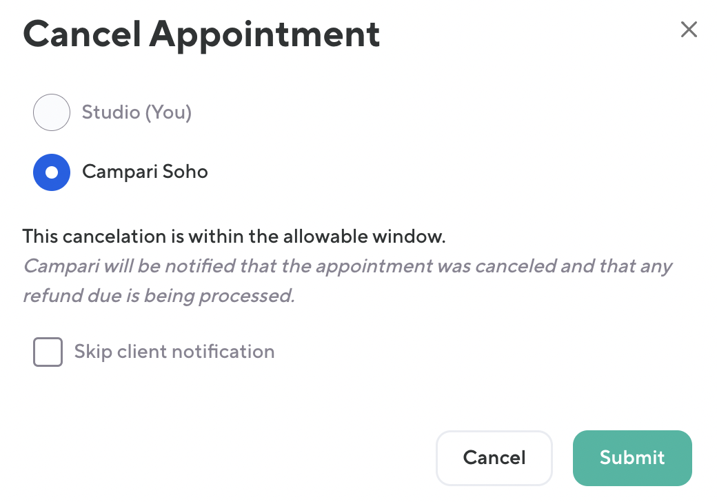 Cancelations made by the studio will always return the appointment session back to a pack/ plan or refund the client's single session (standard pricing) back to their original payment method. In other words, this option will always result in what can be considered an "early cancelation". Unlike classes, appointments do not have the option to refund a single sessions back to account credit or the original payment method.