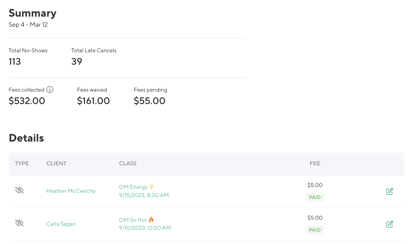 This section displays the type of cancellation, the client who either no-showed or late canceled, the class name, date and time, and the status of the fee. Use the edit icon on the far right of the report to waive or apply no-show and late cancel fees.
