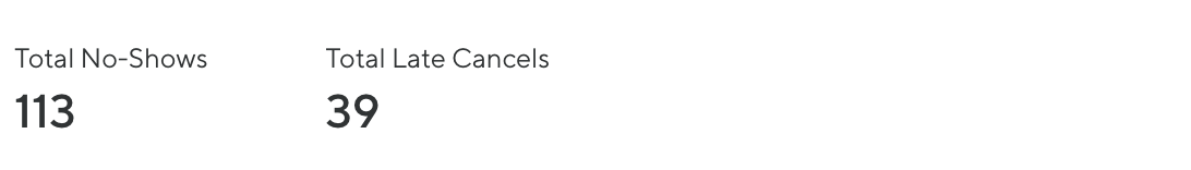 Displays the total number of late cancels for the selected period. This includes late cancels with fees applied and waived.