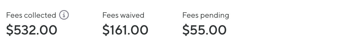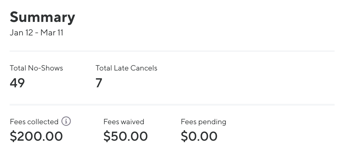 Total amount of fees collected for the selected period. This does not include account balance fees. When a client does not have a credit card on file or if the card on file fails, the fee will be charged towards their account balance rather than to a card. The Fees Collected section only accounts for fees that are paid via a client's card on file. View all clients with an account balance via the Contacts list located on the navigation menu. The Contacts list includes all clients with an account balance owed and a balance to use. Keep in mind that balances owed on this list can be accumulated for reasons other than no-show and late cancel fees.