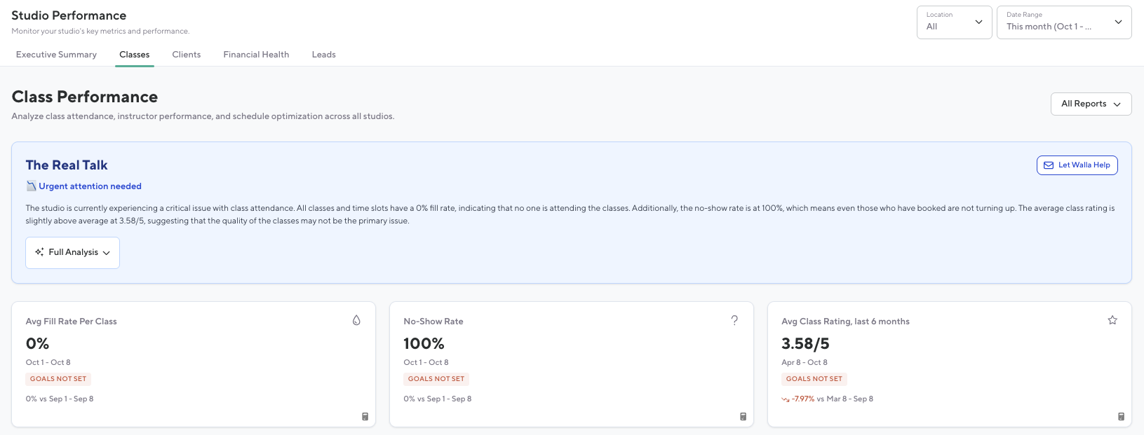 The Classes tab helps Studios understand how your schedule is performing so you can make informed decisions that drive growth. It brings together clear insights, trends, and action steps—no spreadsheets required.