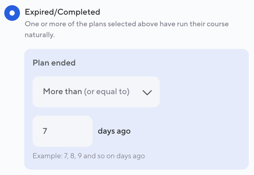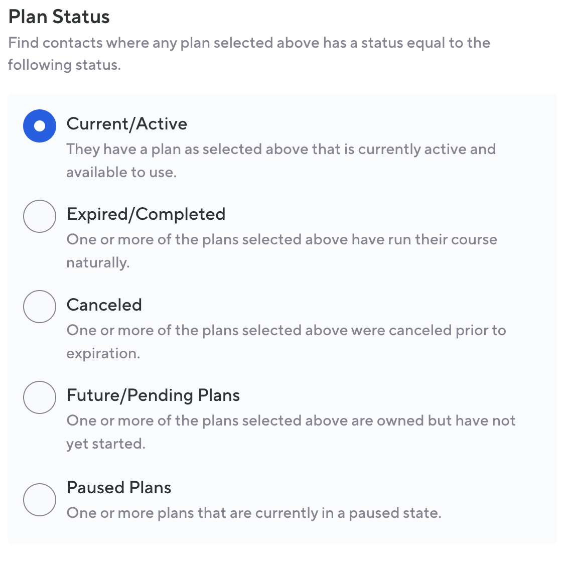 Easily find contacts based on their plan status. Use this condition as part of your marketing automations or create audiences to track clients with plans in specific states.