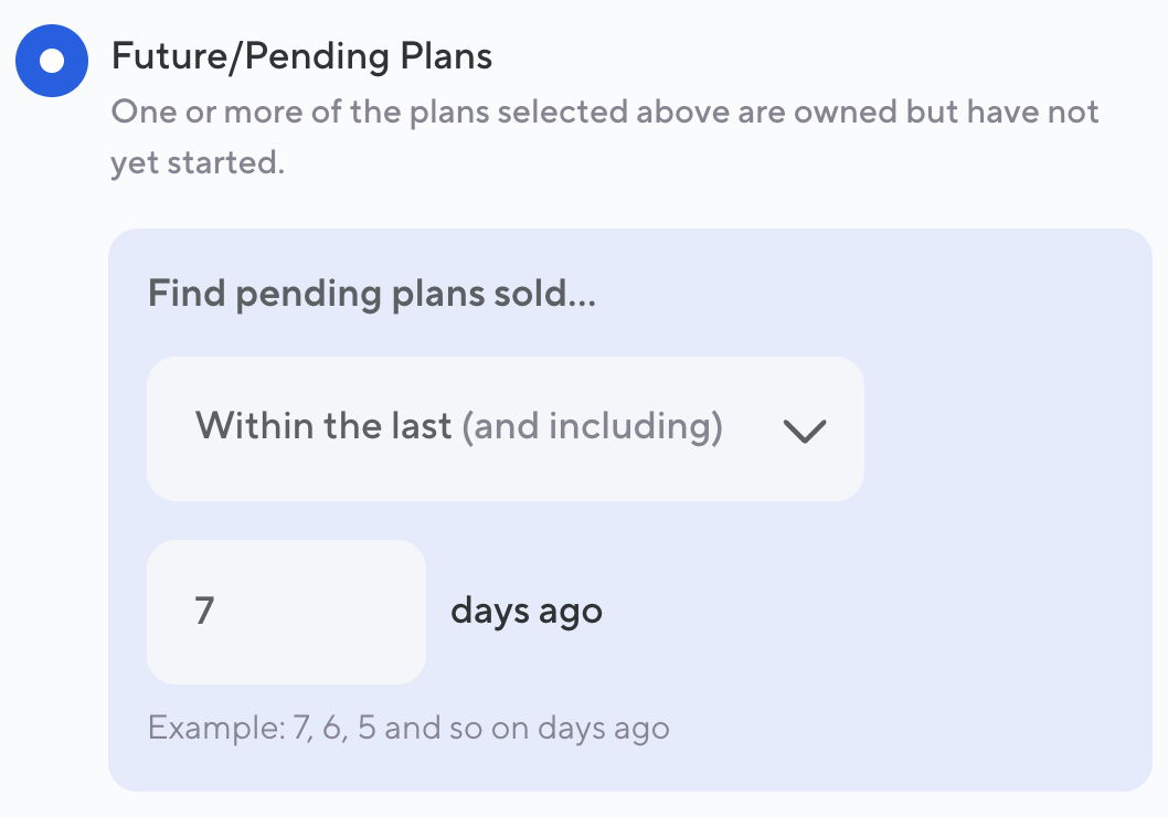 One or more of the plans selected above are owned but have not yet started. Choose one of the following date range options: