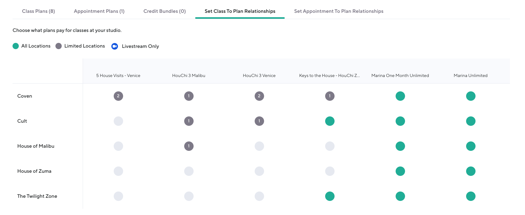 Please note, if you are having issues purchasing a class with a specific plan, the Class to Plan Relationships tab will confirm that the plan is set to pay for that class at that location.