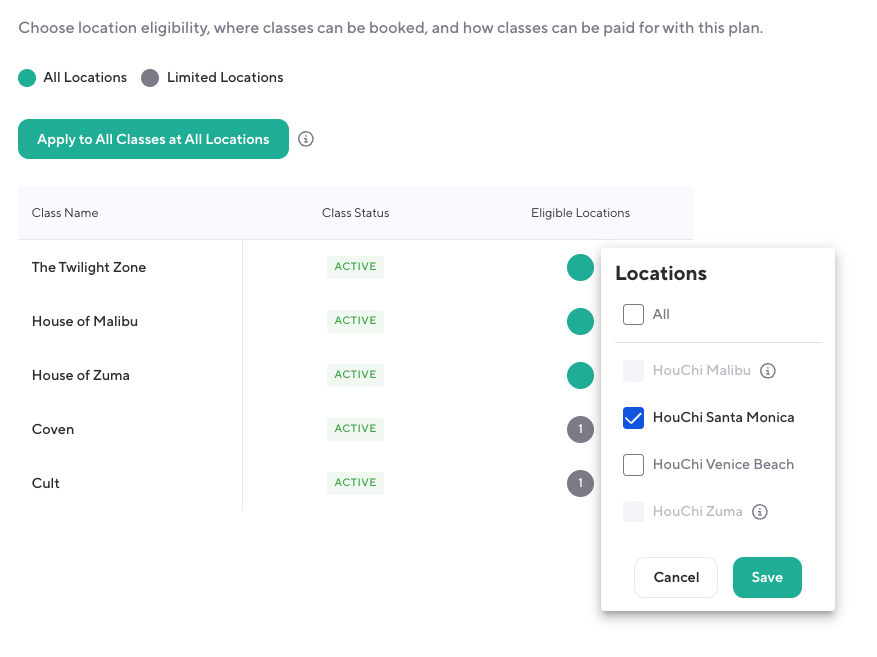 Under the Plan Management tab, you can manage what plans (and locations) will pay for individual classes. For example, if you want all classes covered by a specific plan(s) or if you have a more expensive class that you do not want to be included in your Intro Offer, you can edit, add, and confirm that in Plan Management under Class-to-Plan Relationships tab.