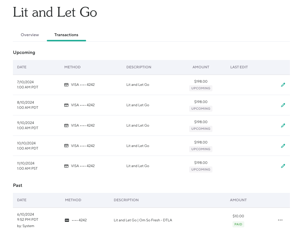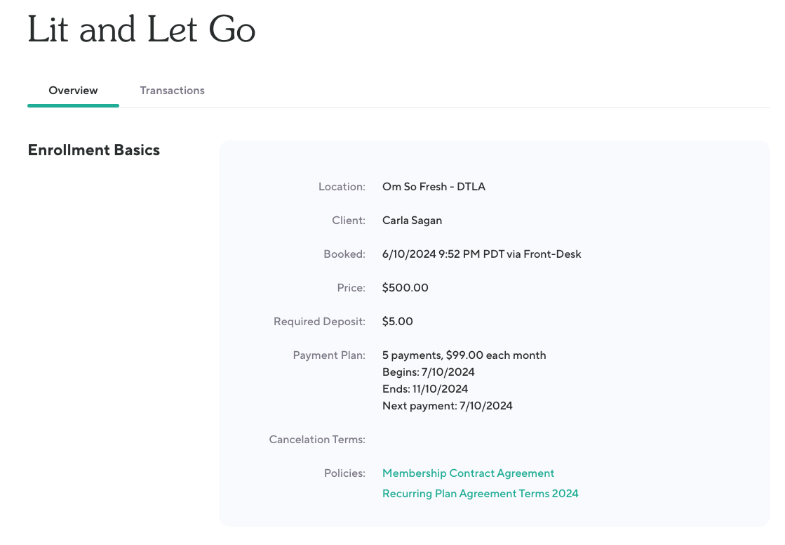 On the client's enrollment page, you will see a holistic view of their enrollment, including upcoming and past transactions. This will allow you to easily manage scheduled payments and understand the client's financial history with your business.