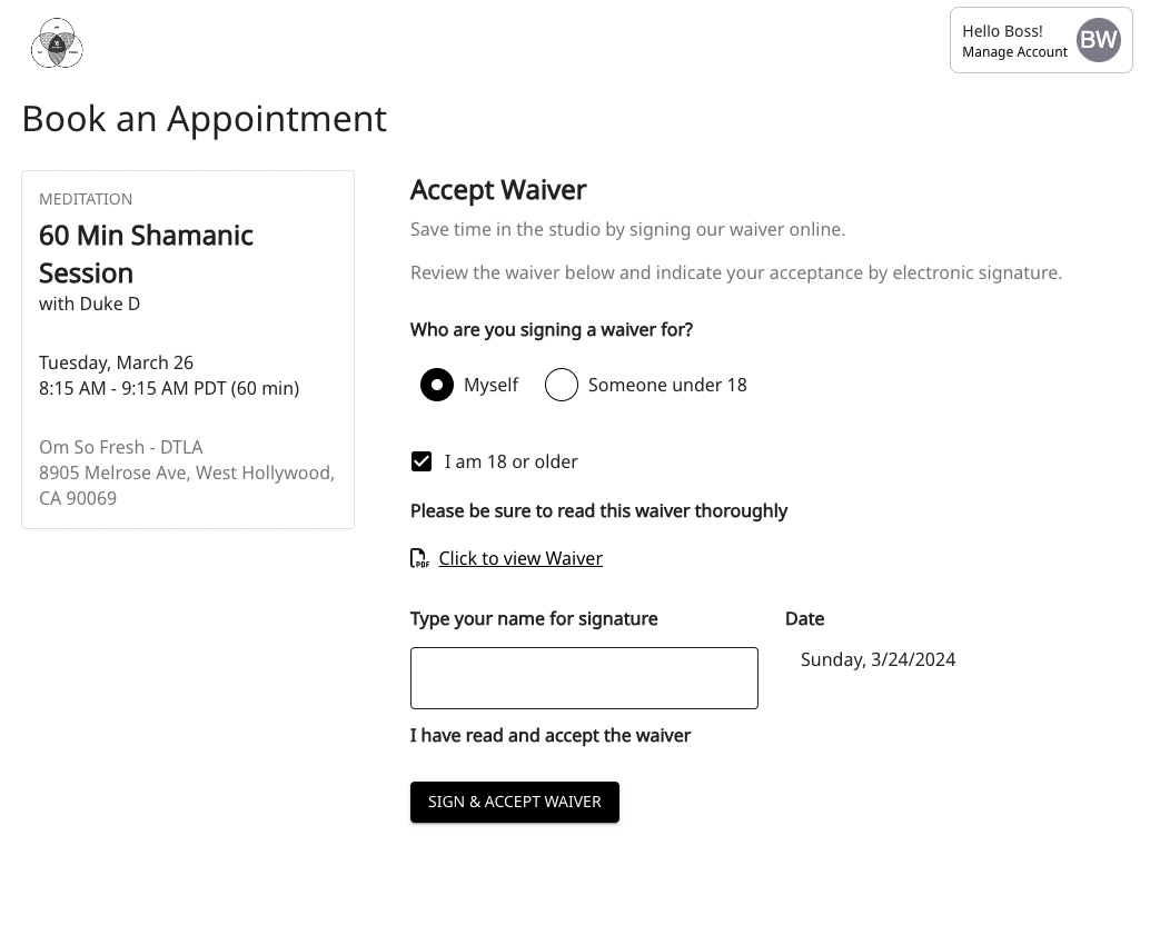 When a client books either a class or an appointment on the widget or Walla App, prior to booking the client will be prompted to agree to the waiver.