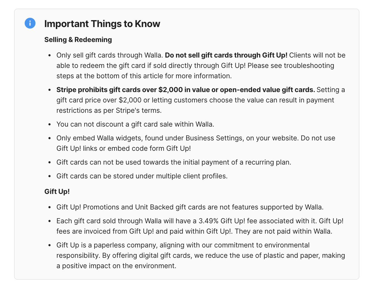 This article is your guide to selling, redeeming, editing, troubleshooting, and managing gift cards. Everything related to gift cards and the GiftUp! integration can be found here. With Walla's integration through Gift Up!, you can set up and sell digital and physical gift cards. It is essential to set up and sell gift cards correctly using Walla and Gift Up! Never sell Walla gift cards through Gift Up! directly.