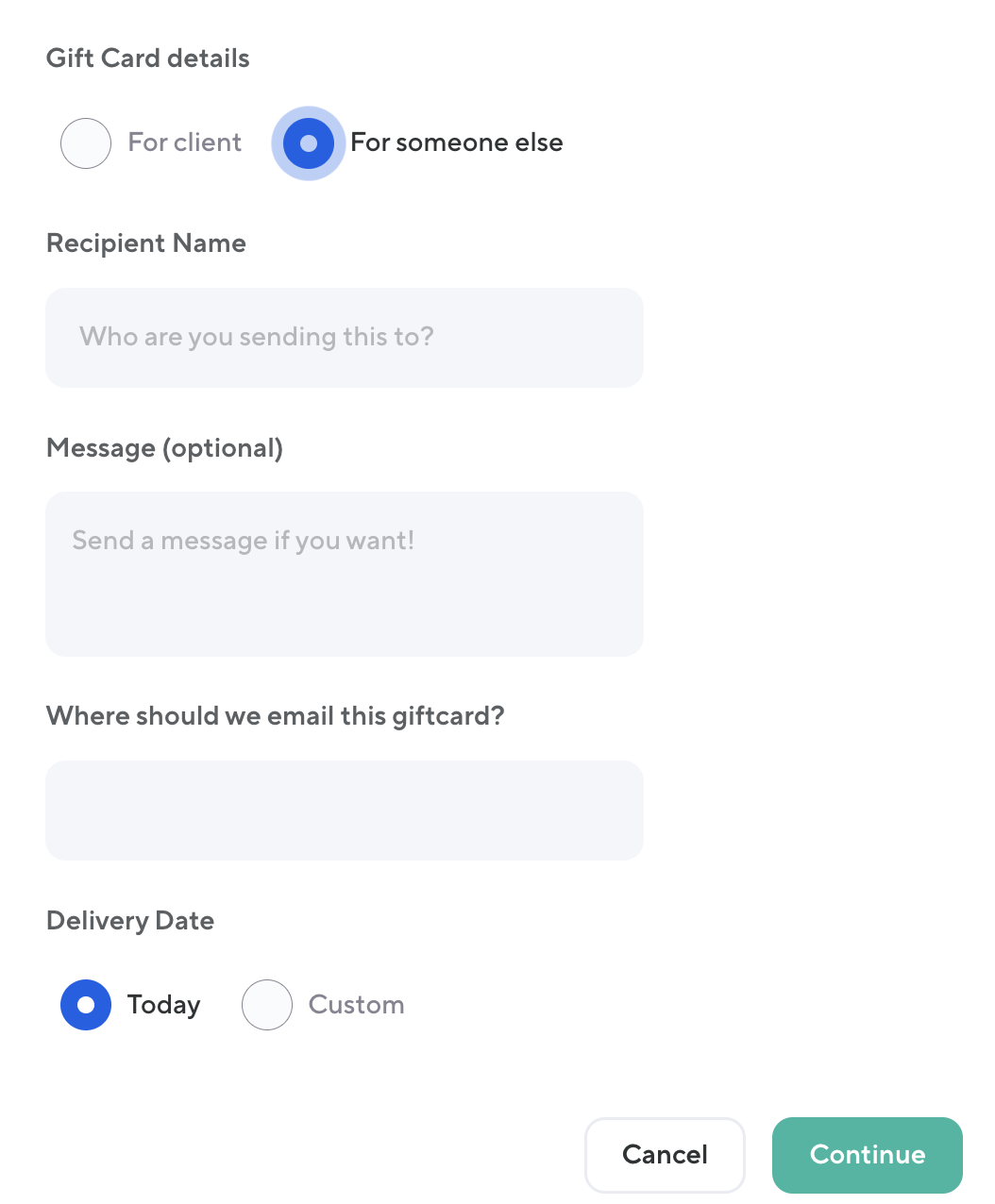 Delivery Date Custom: If the recipient has a client profile at the studio, and send now is selected, the gift card will be automatically added to the client's profile and the recipient will immediately receive a gift card email notification. If the recipient does not have a client profile at the studio, a profile will be created for the client using the email entered, and the client will only receive an email notification on the selected date.