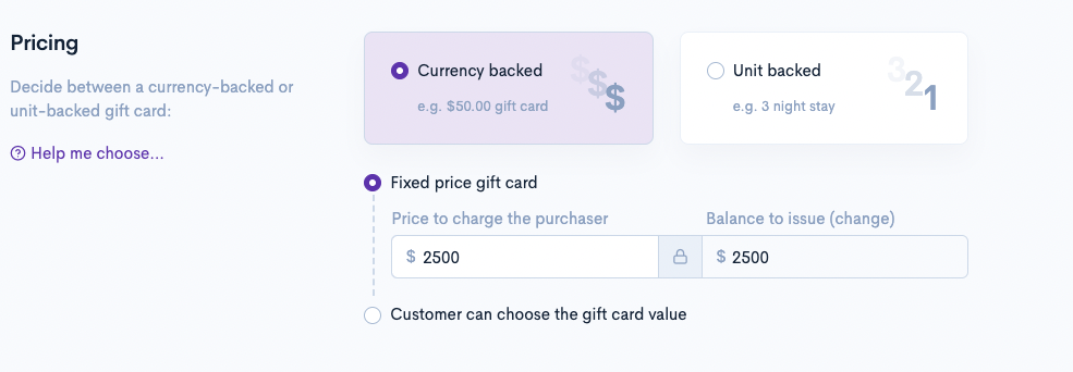 Select the lock icon to unlock the fields and enter the amount to be issued in the Balance to issue field and enter $1 in the Price to charge the purchaser. You must enter a value, you can not enter in $0.