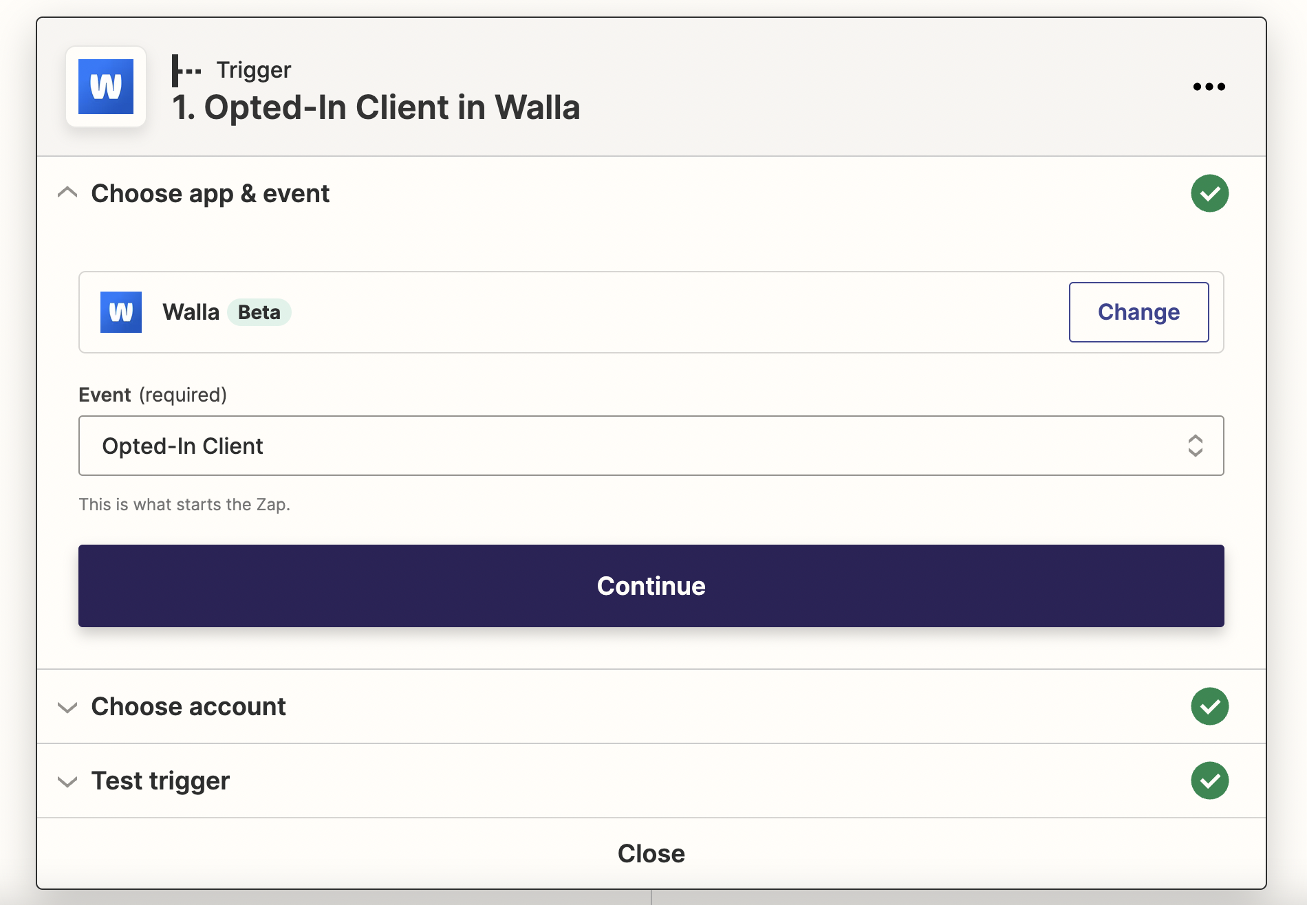 After publishing your Zap, we suggest renaming your Zap to reflect the Walla event trigger. In the above example our event is Opted-In Client in Walla so we named our Zap Opted-In Client in Walla: