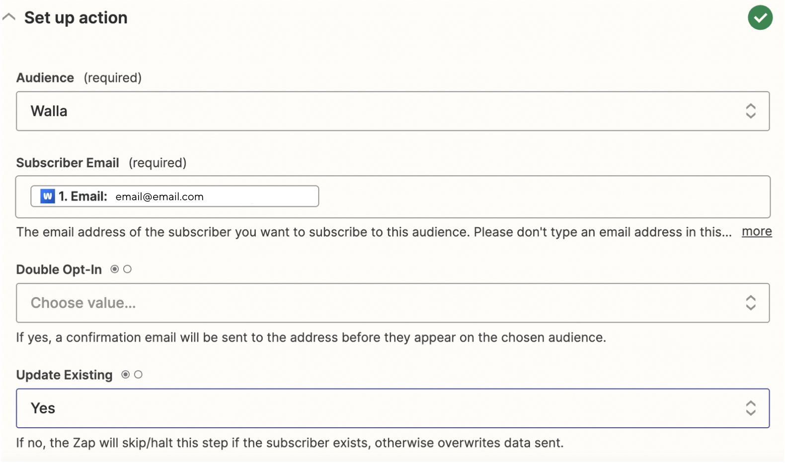 The set-up action will be the fields that will be imported from Walla to Mailchimp