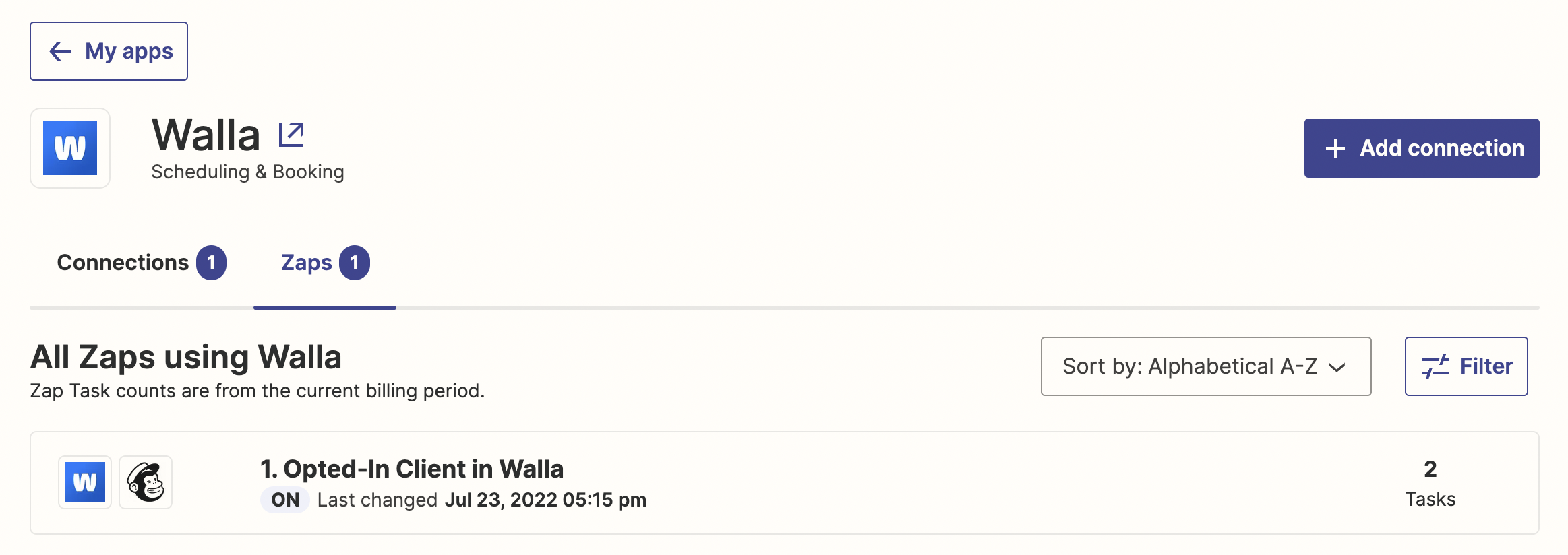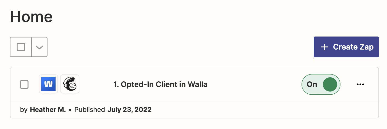 A Zap is an automation. In this case, Opted-In Client in Walla is a Zap that Zapier runs when a client opts-in to marketing emails. Zapier also checks Walla for clients that opted-out. This is another Zap.
