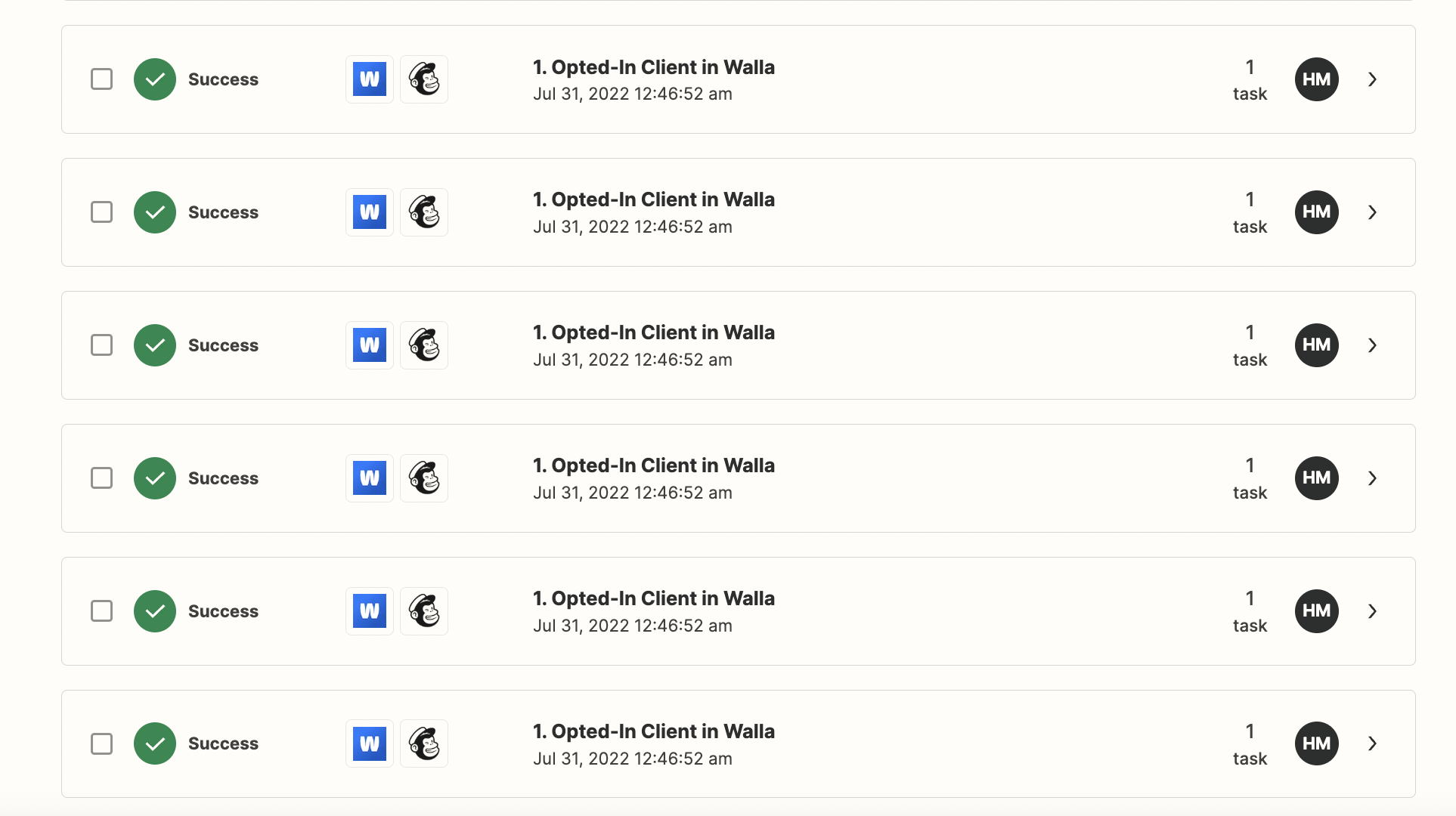 When the opt-in Zap runs, Zapier pulls over a client. When a client or lead is sent to Mailchimp, that is considered to be a Task. The same goes for when a client or lead opts-out.
