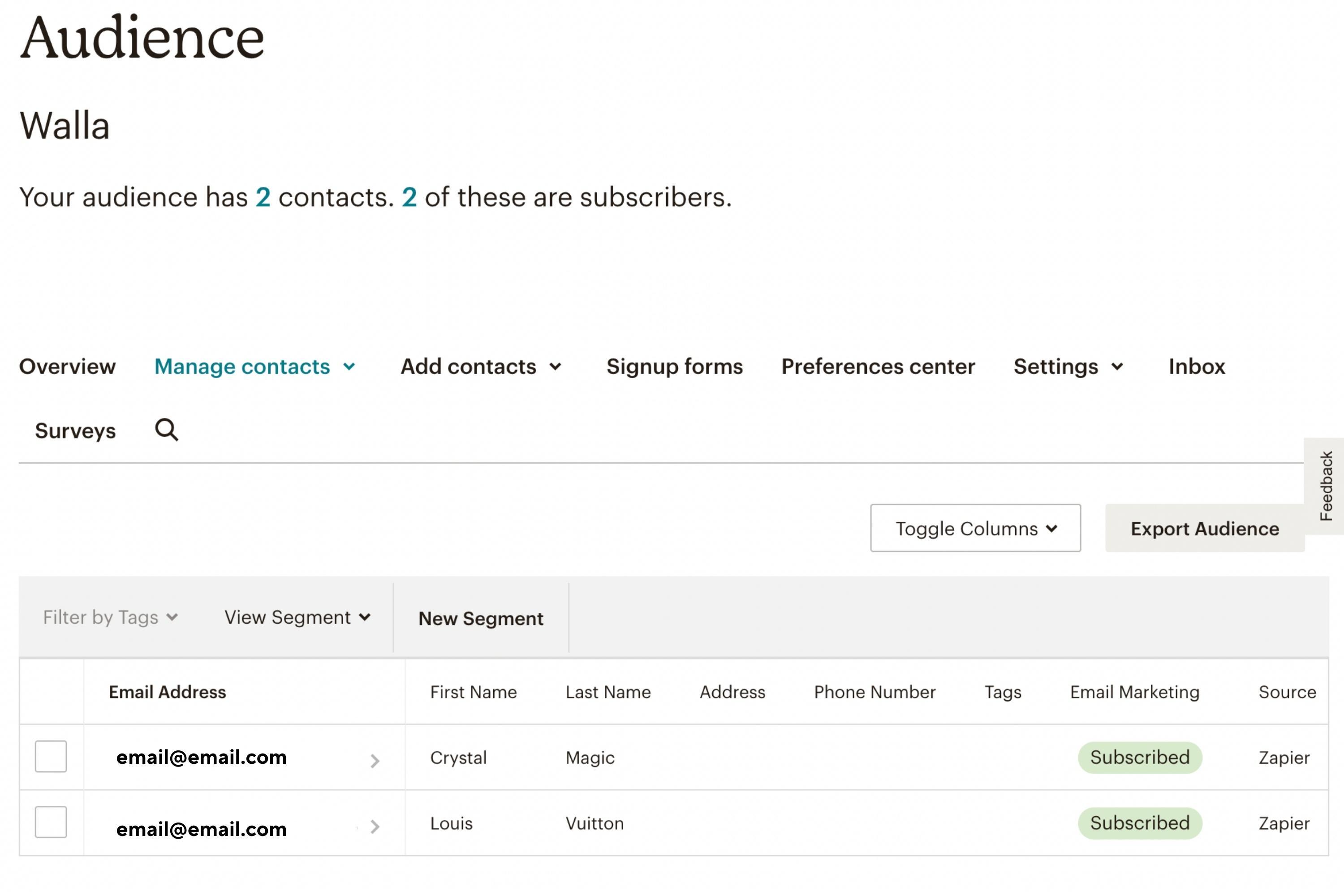 It is important to know only new contacts will be imported. Historical contacts will not be imported. Before activating your Mailchimp Zap, we suggest exporting your clients and leads from Walla and importing them into Mailchimp. You'll want to create an Audience in Mailchimp before getting started.