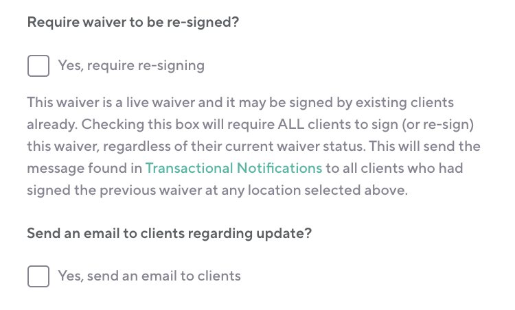 To send the updated waiver to all existing clients, check the box next to Require waiver to be re-signed? This will send a notification to all clients who have previously signed the waiver, prompting them to re-sign the updated version.