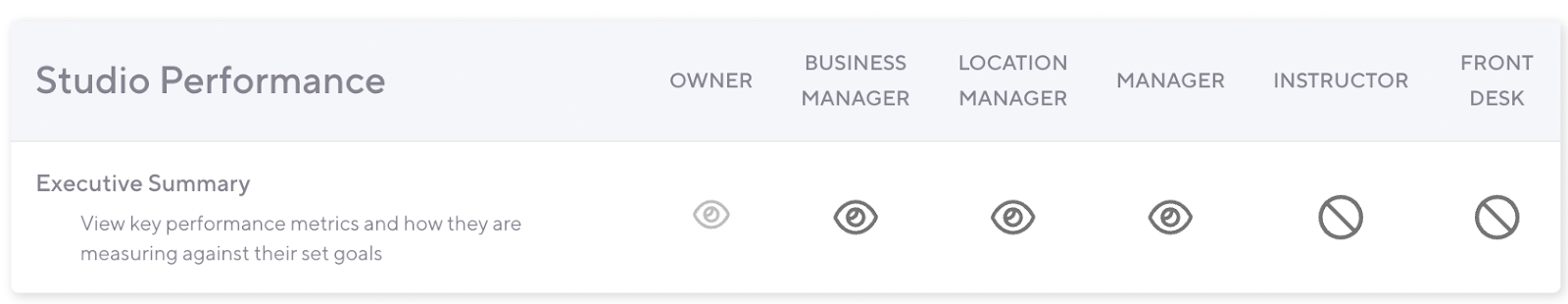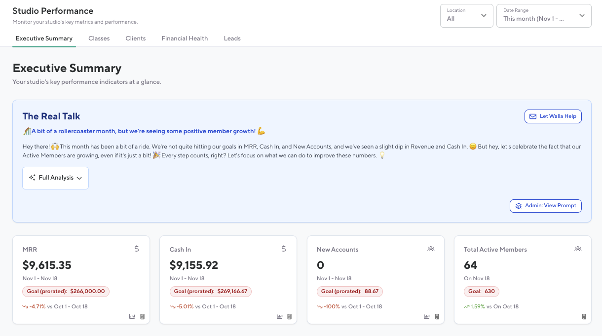 The Executive Summary Dashboard summaries what has happened at a studio within the current month and provides actionable items to increase the studio’s goals.