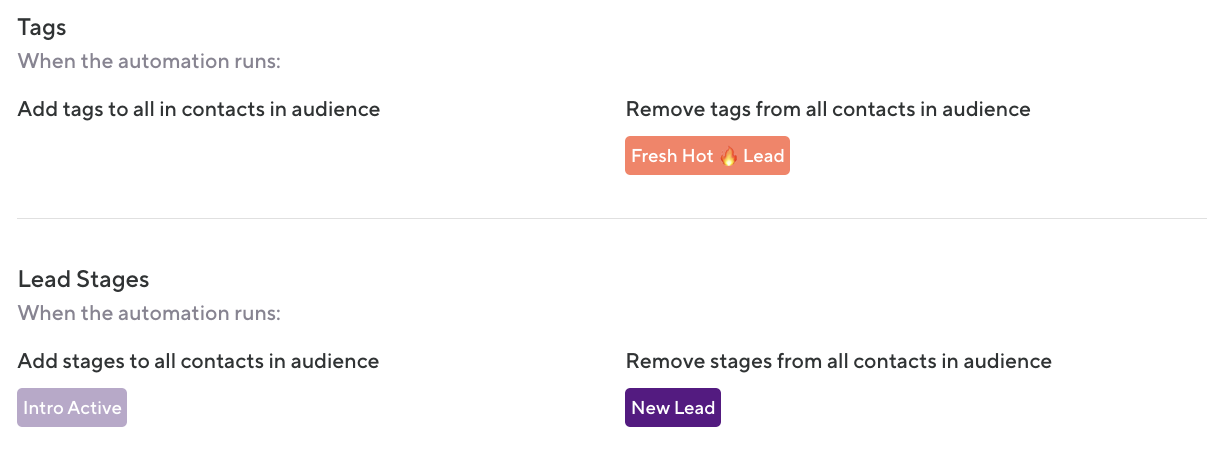 Select Remove Tag and choose the tag from your entrance automation (i.e. In our example we are going to choose the Fresh Hot 🔥 Lead tag)