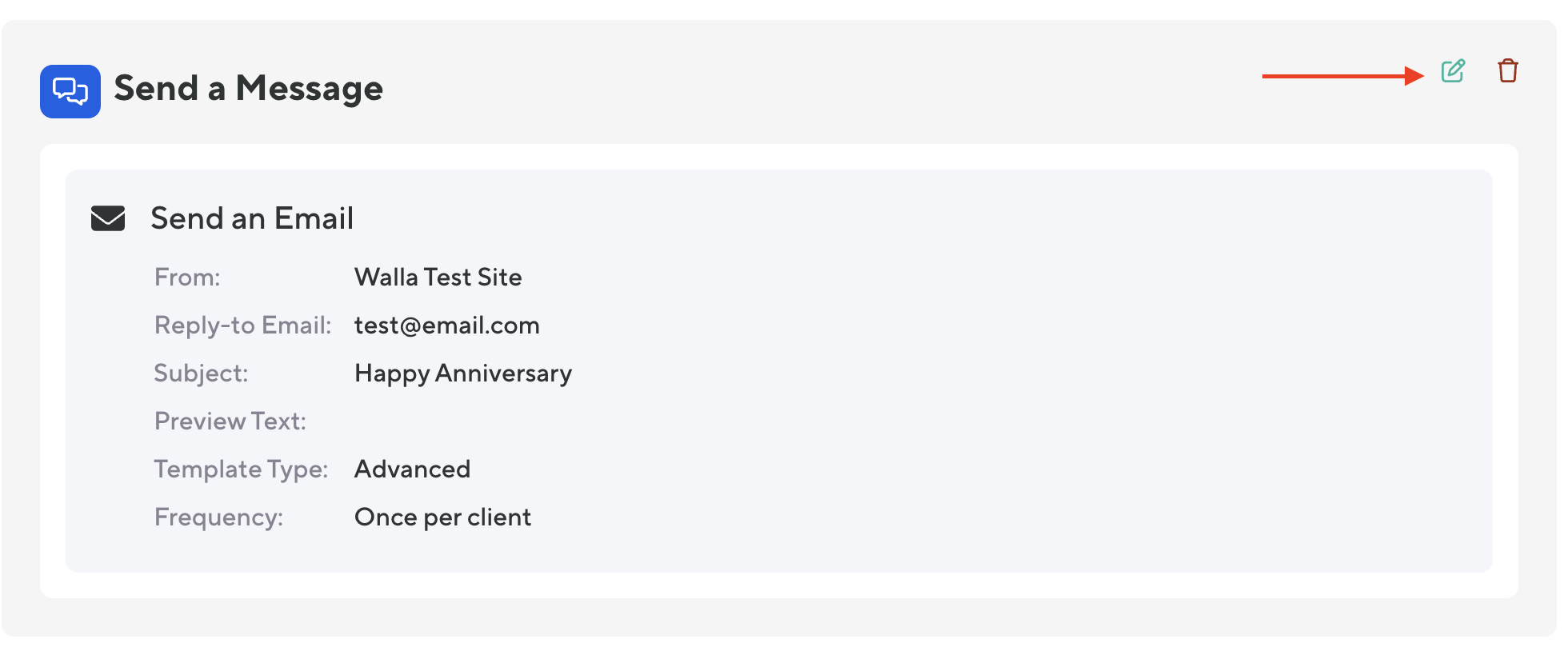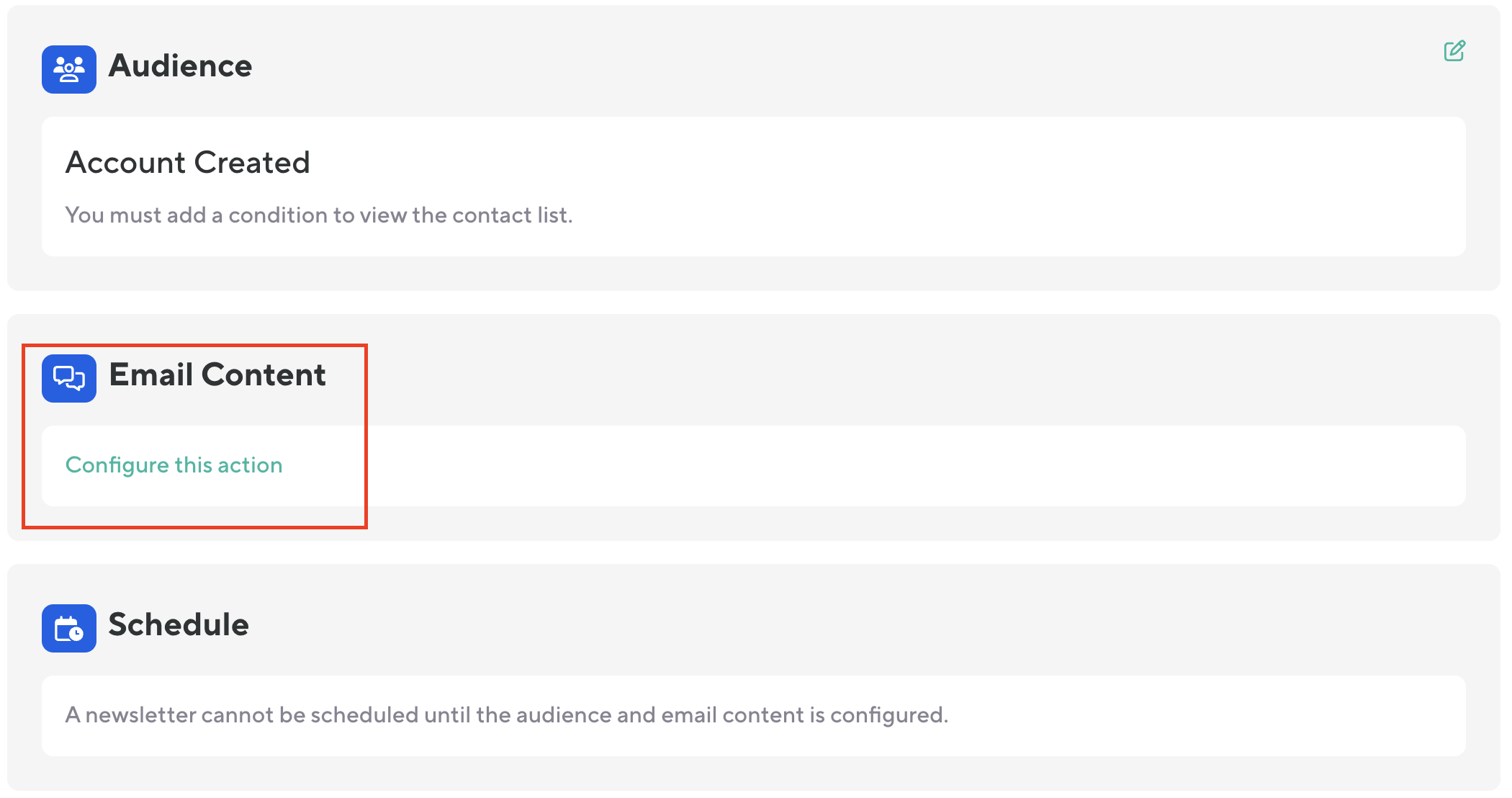 Select "Configure this action" under the Email Content section or, if you are editing an existing email you'll select the pencil icon in the top right corner of the Email Content section